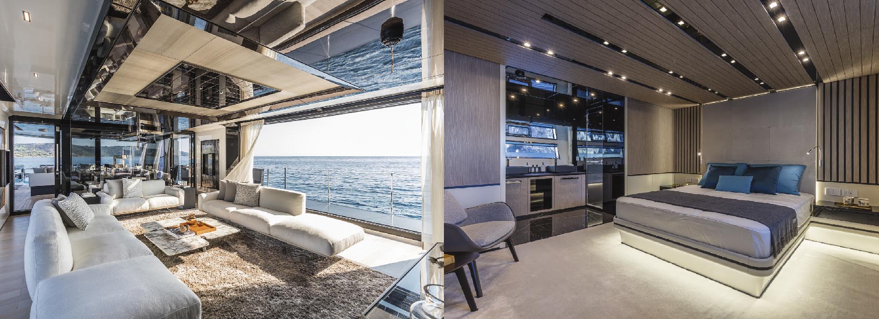 Kun matkustaa A115:n kyydissä – aivan kuten kaikissa muissakin Arcadian jahdeissa – matkustajan ei tarvitse ”astua sisään tai ulos”, koska voit aina nauttia sinua ympäröivästä merestä. Viidennessä rakennetussa A115-jahdissa on erityisen vaikuttava tilasuunnittelu, koska sen kolme kantta tarjoavat peräti 500 neliötä elintilaa. Alimmalla kannella vieraille on tarjolla kolme eri kaksoishyttiä (erikoistilauksesta, normaalisti alimmalta kannelta löytyy neljä vierashyttiä).